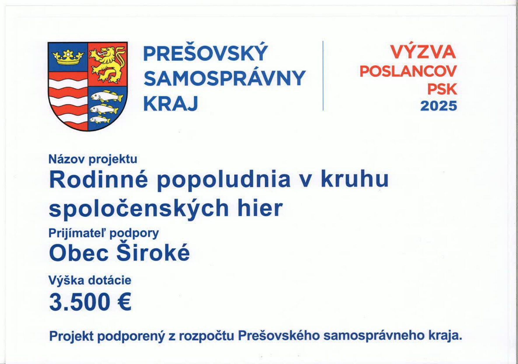 Obec Široké ďakuje Prešovskému samosprávnemu kraju za finančnú